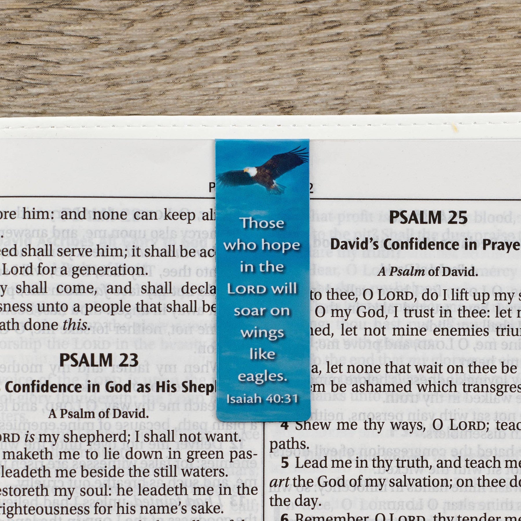 Each magnetic bookmark features a serene and relaxing scene, from an eagle flying in a blue sky and a sunset view on the water, to a fall day and footprints in the sand. These scenes are continued on the back of the magnets. Choose whichever scenic magnet puts your mind at ease, and use the Christian bookmark to mark your spot. The sentiments included on these are taken from beloved Bible verses or inspirational poems and hymns.