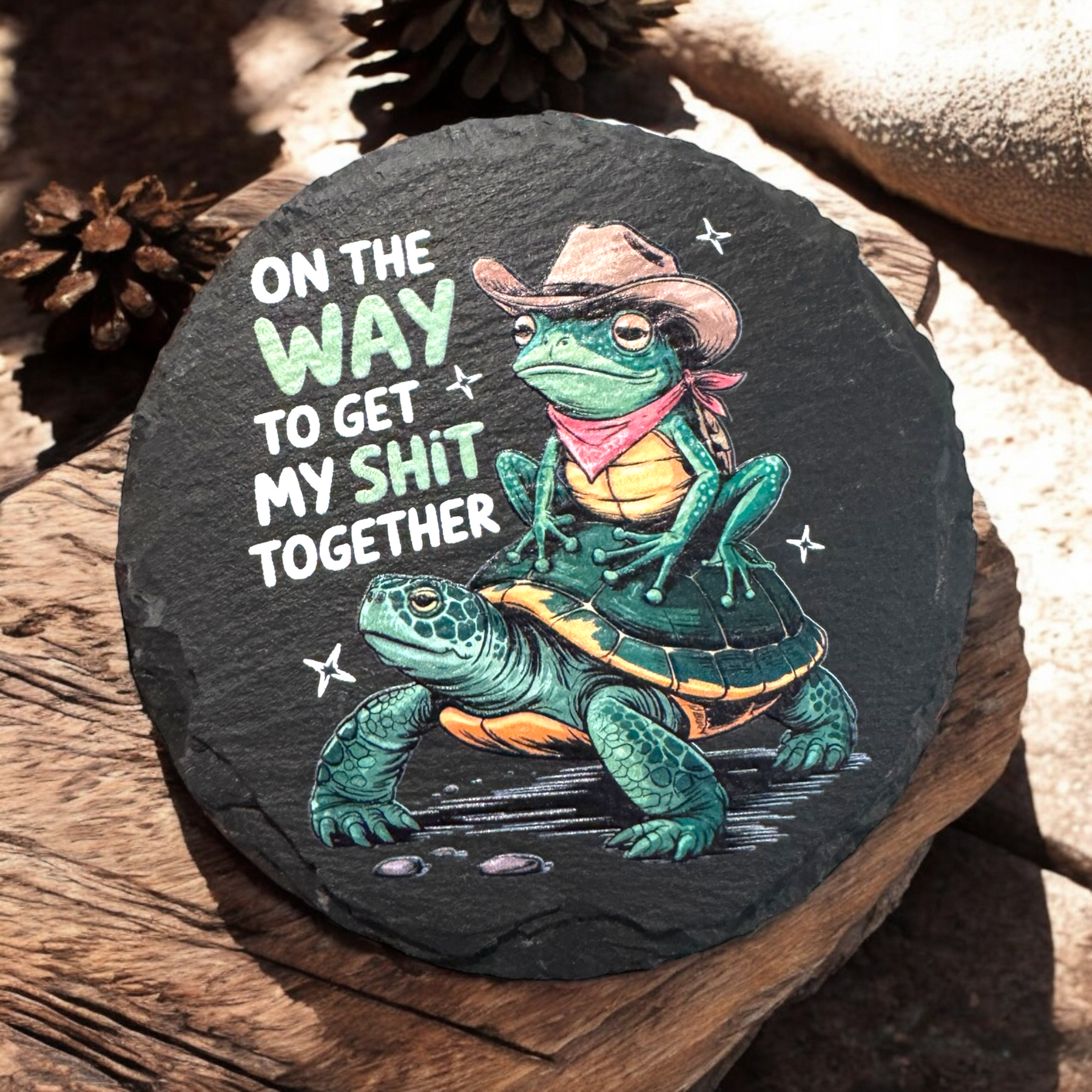 Add a splash of humor to your coffee break with the "On The Way" slate coaster. UV printed for vibrant, lasting color, this playful coaster keeps your surfaces safe while reminding you that getting your stuff together is a work in progress. Perfect for desks, coffee tables, or anywhere you need a little motivation with your morning brew.