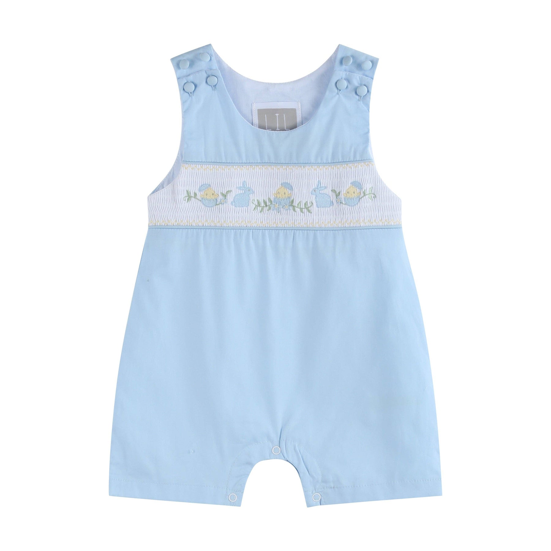 Celebrate Easter in style with our "Light Blue Easter Smocked Shortalls" for your little gentleman! Crafted in playful blue cotton, these shortalls feature charming smocking with embroidered bunnies and baby chicks, adding an extra touch of cuteness to the festivities. The thoughtful design includes snaps at the crotch for quick diaper changes and buttons at the shoulder for adjustable sizing, ensuring a comfortable and adorable fit. Watch your little one hop into Easter joy with this irresistibly charming outfit!